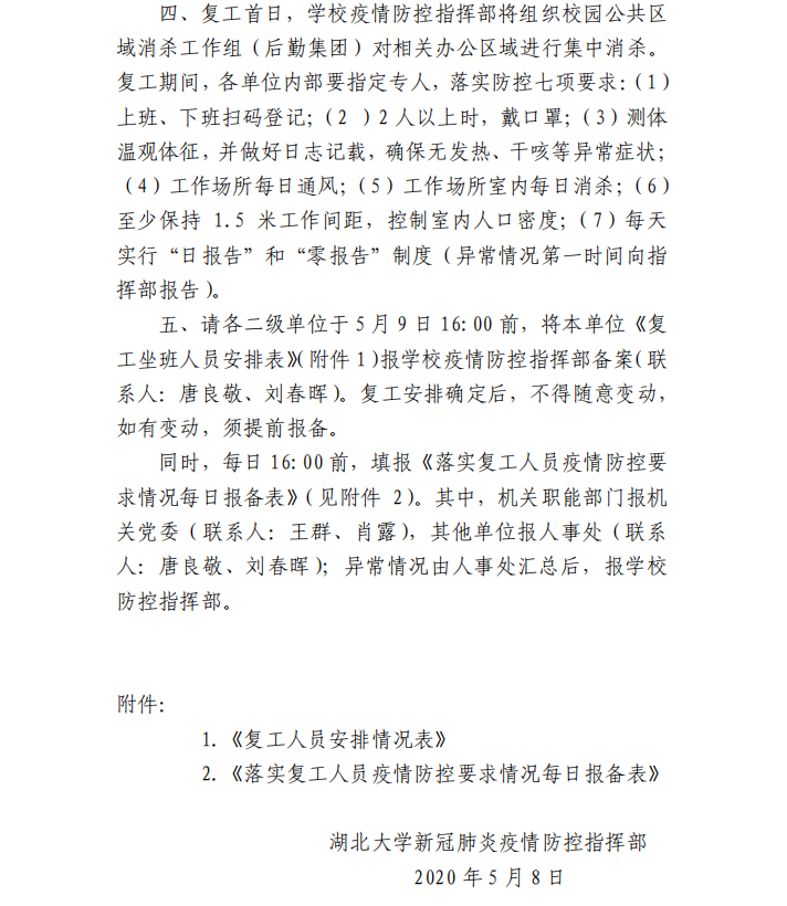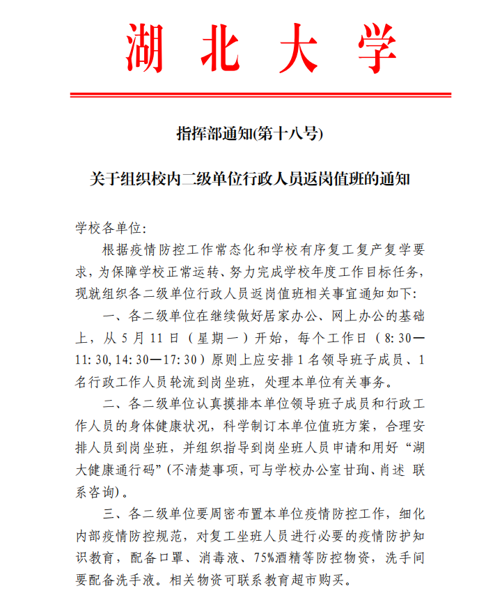 关于组织校内二级单位行政人员返岗值班的通知(第18号)