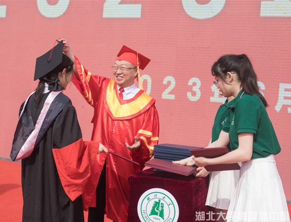 学校领导和教师代表为毕业生们拨穗正冠,颁发学位证书,并合影留念。