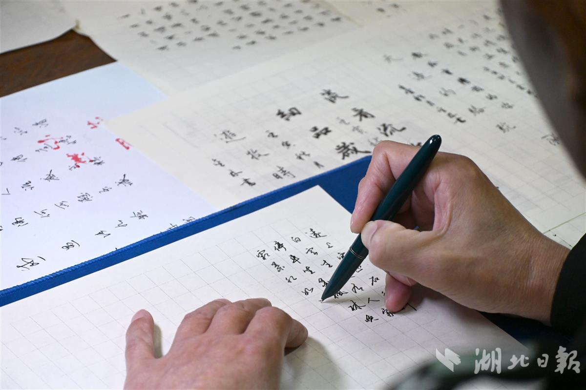 当时,陈金林一边翻阅《唐诗三百首》,一边手握钢笔练字。一句句用行书摘录的唐诗,跃然纸上。他告诉学生:“在不忙的时候,我会用书法充实自己。”