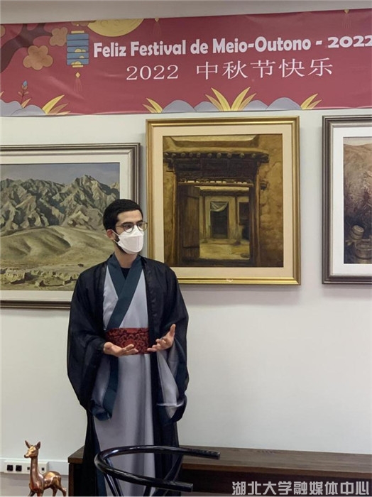 巴方院长保利诺教授在致辞中强调,孔子学院在促进巴中人文交流、增进民心相通方面发挥着重要作用;暂时无法抵巴的中方院长叶丹通过视频用“但愿人长久,千里共婵娟”表达对巴西师生的挂念和祝福。巴西本土教师卡洛斯·内托介绍了中秋节的起源、风俗,分享对《水调歌头·明月几时有》的理解,并带来诗词吟唱穿插长笛吹奏的《九月九日忆山东兄弟》;公派教师何丹用葡萄牙语向大家讲解中国的茶文化;汉语初级班学员身着汉服演唱歌曲《无羁》,大家在丰富有趣的体验中了解中秋民俗,感受中秋之乐。