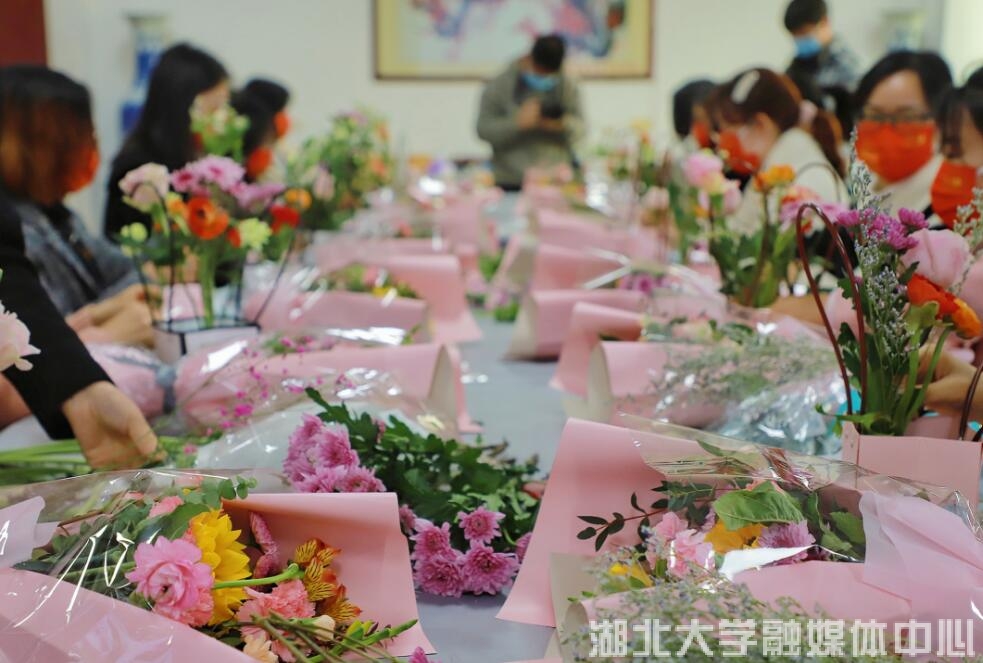 这15名女教师,有科研突出教师代表、教学突出教师、专注学生工作的辅导员。7日下午,学院早早便将现场布置成花的盛宴,静候每一位辛勤工作的女教师赴约。修剪枝叶、搭配颜色、挑选心仪的花枝,大家相互帮助提出参考意见,并拍照留恋。叶葱选择以粉色系与玫红色系的洋牡丹为主,辅以情人草和小雏菊做装饰。“粉色代表了女性的温柔,玫红色相比于粉色更显成熟稳重,主花洋牡丹是我最喜爱的一种花。”她介绍道。 插花活动结束后,15名女教师们分别下沉到校内相关地点,配合相关工作人员提醒学生佩戴口罩,检查通行证和健康码。从下午三点半到四点半,女教师们指挥学生们有序排队、间隔一米,正确佩戴口罩并出示健康码和通行证。“我们的女神节不仅是收获祝福,更是在属于我们的节日里为疫情防控做贡献,展现新时代的女性力量。”物理与电子科学学院行政党支部书记夏燚说。 该院党委书记柳菁介绍,举办女神节茶话会,主要是倡导女教师们拥有独辟蹊径的创新意识、独具慧眼的思辨视角、独当一面的工作能力、独到之处的工作方式、独树一帜的人格魅力。“在这个属于女神们的节日里,我们希望每一位女教师能够在工作之余,热爱生活,更热爱自己,同时不忘责任,为社会做贡献。”柳菁说。(中国教育在线 通讯员:刘子琪 陈思瑾)