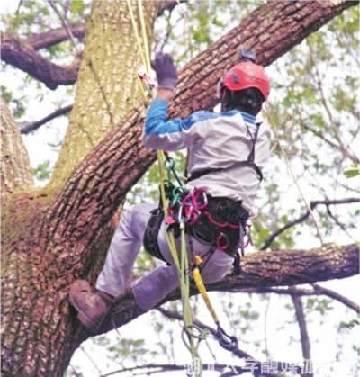 他介绍,攀树类似于攀岩,课程内容包括上升、下降、走枝、飞枝等动作的训练,测评树木周围环境的教学,远比想象中丰富专业得多。从识别什么样的树可以爬、判断主绳要挂在哪一条枝上,到动手做重力测试、学习组装攀树工具,都是专业性极高、挑战性极大的任务,对学生解决问题的能力是极大的锻炼。