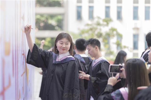 “毕业快乐!”“加油,后浪青年!”“很高兴能陪你们走过这一段,见证你们的青春成长。愿再相遇时,你们仍是少年!”教师们带着深情的祝福,与毕业生一起踏上“彩虹启航路”。师生们手持加油牌合影,并纷纷在签名墙上写下各自的姓名和祝福。