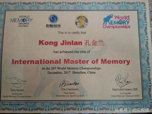 凭借超凡的实力,孔金兰以一小时记忆数字1987个,一小时记忆扑克19副,更以46.88秒快速记忆一副扑克牌的成绩,成为“世界记忆大师”。