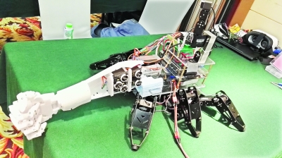 据了解,团队成员给机器人设计了一个数据采集手套,当操作者戴着该手套并运动手指时,手套就可以采集因手指运动而引起的数据变化,进而通过一系列指令控制机器人的机械手臂以及机械手指的旋转弯曲,使3D打印的机械手也能如真人手臂一般灵活,加上底盘安装的仿生结构六足蜘蛛攀爬系统,机器人可以适应各种地质地形。麒麟机器人搭载摄像头,把信号无线传输到手机,体验者将手机放置在VR传感器中,配以陀螺仪,实现体验者身临其境的感觉。团队成员介绍,未来如果推广应用,该款机器人可以在探险、救灾、地质勘探等领域大有作为。