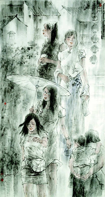 而与前辈们创作的喜悦与笑容所不同的是,胡智勇的作品借助柔和的色调、近似速写方式的人物动态、轻松简洁的笔触、辅助的色彩,让自己的作品充满了一种愉悦的轻松感。这种处理方法来自于他多年的在中国人物画上经验和积累。从某种意义上来看,胡智勇正是以他独特的方式表达着对现代生活热爱,诠释着生命之中永恒不变的话题,它因为生发于内心而显得无比具有生气。近期,胡智勇转向了对都市人物的表现上,创作了《春雨醉江南》、《一树桃花带雨红》等,则是对现代都市生活题材大胆尝试的体现。