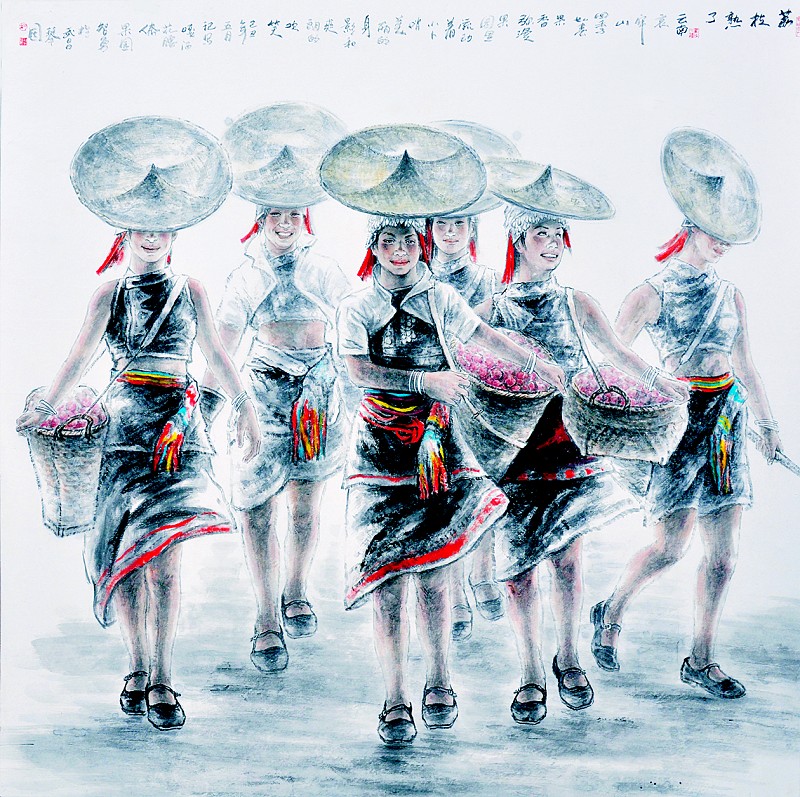 胡智勇是一个画家,更是一个文人。他热爱艺术,更热爱生活,并努力在生活中寻找艺术的意义。因此他十分善于观察生活,特别是令他感动的事物,他总是乐此不疲去表现。在他的创作中,女人成为他最关注的题材。在智勇看来,女人能顶半边天,女人的世界既是神秘的又是美丽的。女人承载了世界上最美的东西——无私奉献、善良勤劳以及那无尽的柔美。为此,他创作了大量描绘妇女的题材,特别是创作了大量以少数民族人物为主要题材的作品。对少数民族题材的热衷出于他对少数民族有着特殊感情,他每年都要去云南、鄂西与少数民族过春节。在与少数民族的一起生活接触的过程中,少数民族的服装服饰、风俗习惯、音容笑貌都深深地印入在他的脑海之中。在那个世界里,他感受到了城市之中已经消失的某种文化。而这种文化曾经是人类最宝贵的财富之一。在那个世界里,他更感受到了少数民族那种独特的善良美丽,这种感觉深深吸引着智勇。他曾多次参加彝族傣族的泼水节,并创作了以泼水节为题材的系列组画——《祈福之水》、《吉祥之水》、《水的祈福》、《水的祝福》等,以及表现少数民族日常生活场景的作品——《有阳光的果园》、《果香时节》、《果园深深》、《荔枝熟了》、《生命鼓舞》等。在这些作品中,人物脸上洋溢的喜悦与笑容是给人的印象是令人难忘的,几乎所有作品的人物表情都是如此。这种微笑我们似乎可以从周思聪先生的作品中找到,在一般人看来,她们的这种形象似乎更接近文革时期的人物形象——勤劳、质朴、憨厚,而在我看来,这种微笑不正是人们对当下美好生活的一种赞美么?不正是对劳动人民的肯定和赞美么?不正是对和谐家园的最好的表现么?