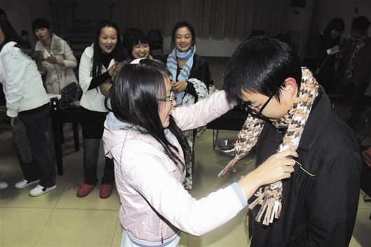 据了解,该班一共49人,其中13名女生、36名男生。借助班会,在光棍节搞这个活动,我们主要是想给男生们一个惊喜。一女生说,冬天来了,他们正需要围巾。现场,一直等到班会尾声,众人将灯光熄灭,男生们才突然意识到将有惊喜降临;随后,每人抽签,从女生手中领取围巾。