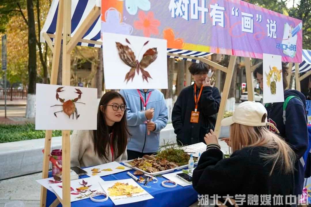 在树叶有“画”说的展位前,几名学生正有说有笑地用各式树叶和枯枝摆造型,十几分钟后,插满金灿灿银杏树叶的花瓶、张牙舞爪的螃蟹……出现在同学们面前。负责展位的艺术学院2104班班长张有福说“为了让同学们发现大自然的美好,我们在校内捡拾了好久,收集到各式各样的落叶,长短不一的枯枝,更多选择,更多创意”。